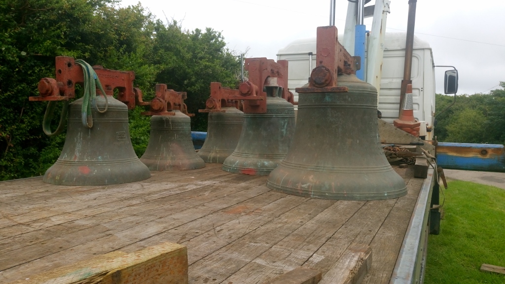 The bells were lifted onto the lorry by a crane attached to the lorry.